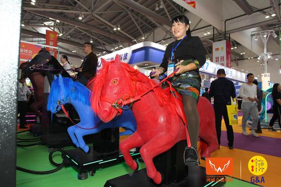 如金馬科技的GJT-60A觀景塔、ZB-72A轉(zhuǎn)轉(zhuǎn)杯、3D互動(dòng)軌道車;世宇的動(dòng)感戰(zhàn)機(jī)、怪獸獵人、一球成名、糖果扭扭蛋;華立的瘋狂兔子、頭文字D ZERO、巨獸浩劫2幸運(yùn)光圈;大新的裝配式智能泳池;通利動(dòng)漫:粉紅格格禮品機(jī),海綿寶寶游樂設(shè)備;牧童的叢林水寨、皮筏滑梯、牧童繽紛水屋,日東的繽紛射球、旋風(fēng)摩托;智跑的中型懸掛過山車、彈射過山車;金滿鴻的樂吧車、戰(zhàn)火金剛、幻影摩托;燁睿的一推天下、YOYO派對(duì);兩只老虎的翻滾車、倉鼠球……