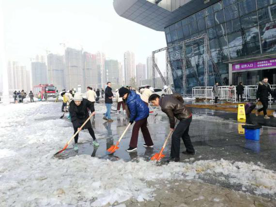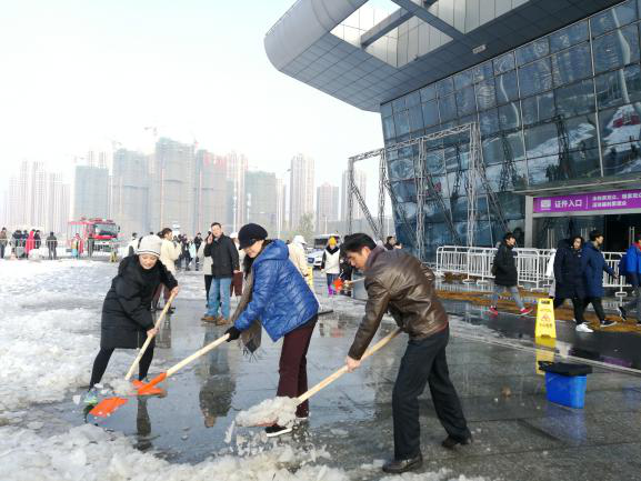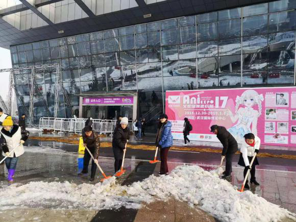 為了現(xiàn)場(chǎng)的人員安全,2018年12月31日清早,漢陽(yáng)區(qū)會(huì)展和物流中心主任李明紅、副主任牛海彤等領(lǐng)導(dǎo)帶頭在武漢國(guó)際博覽中心開(kāi)展了鏟雪除冰活動(dòng),清除展館B0登錄廳外路面積雪,消除安全隱患。大家拿著準(zhǔn)備好的鐵锨、推車(chē)、大掃帚等工具,在零下的溫度,冒著刺骨的寒風(fēng),干勁十足地?fù)]動(dòng)手中的鐵鍬和掃帚,一起鑿冰、鏟雪、掃雪,場(chǎng)面熱火朝天。區(qū)會(huì)展辦率先垂范,齊心協(xié)力,大家花了近一個(gè)半小時(shí)時(shí)間,清掃出展館外各主要路段的積雪。通過(guò)鏟積雪、鋪草墊、排隱患、送溫暖等舉措,確保第十七屆艾妮動(dòng)漫游戲展開(kāi)展期間秩序穩(wěn)定,來(lái)現(xiàn)場(chǎng)參與活動(dòng)的人員基本未受影響。