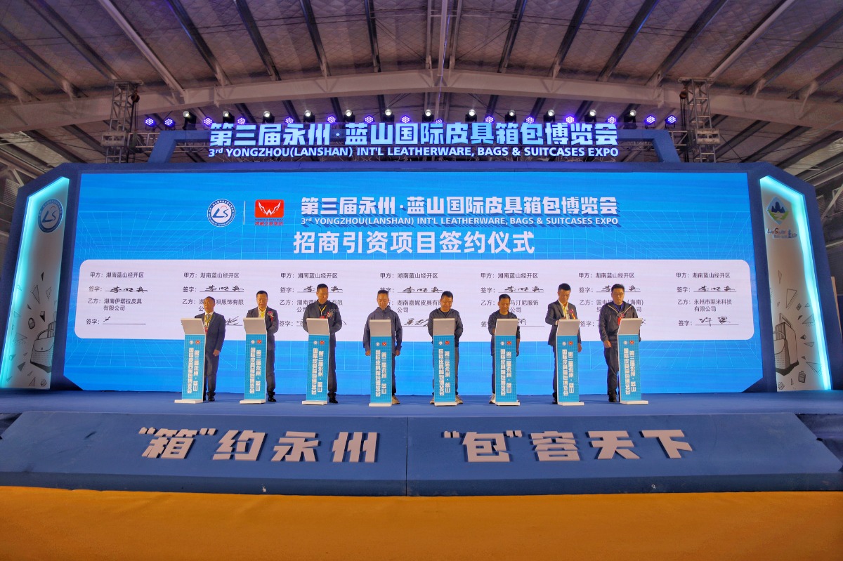 3月24日上午,第三屆永州·藍(lán)山國際皮具箱包博覽會在湖南省永州市藍(lán)山縣皮具箱包科技產(chǎn)業(yè)園創(chuàng)品國際智慧物流園拉開帷幕。本屆博覽會以“‘箱’約永州、‘包’容天下”為主題,現(xiàn)場簽約招商引資項目14個,總投資金額13億元,現(xiàn)場簽訂外貿(mào)訂單8單,簽約金額3.5億元人民幣。